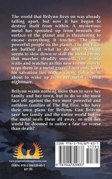 The world that Brilynn lives on was already falling apart, but now it has begun to destroy itself from within. A mysterious metal has sprouted up from beneath the surface of the planet and is threatening to encase everything it touches. The most powerful people on the planet, The Big Five, are baffled at what to do next. Nothing seems to slow down or stall the metal enemy that marches steadily onward. The world waits and watches as this new enemy slowly traps them in a metal grave. Their only hope for salvation lies with a young girl who is about to wake up from her metal covered nightmare. Brilynn wants nothing more than to save her family and her town, but to do so she must face off against the two most powerful and ruthless families of The Big Five, who have their own plans for Brilynn. Can Brilynn save her family and the entire world before the metal seals them all away, or will her world be doomed to suffer a fate far worse than death?