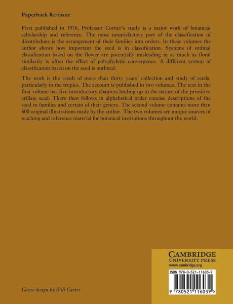 First published in 1976, Professor Corner's study is a major work of botanical scholarship and reference. The most unsatisfactory part of the classification of dicotyledons is the arrangement of their families into orders. In these volumes the author shows how important the seed is in classification. Systems of ordinal classification based on the flower are potentially misleading in as much as floral similarity is often the effect of polyphyletic convergence. A different system of classification based on the seed is outlined. The work is the result of more than thirty years' collection and study of seeds, particularly in the tropics. The account is published in two volumes. The text in the first volume has five introductory chapters leading up to the nature of the primitive arillate seed. There then follows in alphabetical order concise descriptions of the seed in families and certain of their genera. This second volume contains more than 600 original illustrations made by the author. The two volumes are unique sources of teaching and reference material for botanical institutions throughout the world.