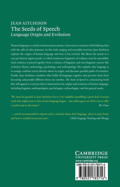 'We must be grateful to Jean Aitchison for so very readably assembling a good deal of recent work that might seem to hint at how language began ... liberally peppered with fetching quotations from all manner of sources, ranging from the cartoon character Charlie Brown through Lewis Carroll to Jonathan Swift's satirical novel Gulliver's Travels ... the author goes out of her way to offer a restful read to all comers.' The Times