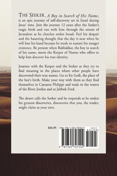 THE SEEKER, A BOY IN SEARCH OF HIS NAME, is an epic journey of self-discovery set in Israel during Jesus' time. The reader joins the journey 12 years after the seeker's tragic birth when his mother dies in childbirth and his grief-stricken father refuses to hold his son and flees into the desert to die. The boy is given the name, Bakbakkar, by the mysterious Keeper of Names. Bakbakkar, the seeker, is raised by his uncle and aunt. Their son, Jared, becomes his best friend, but their sibling rivalry erupts in near death and betrayal. Bakbakkar is cast out. At the Riiver Jordan the boy receives his new name and discovers an ability he never knew he had. He is then faced with a choice. Does he return to the desert with his father, go to Jerusalem and become the son of the woman who supported him before his epic journey began or return from exile to his aunt, uncle and cousin, Jared. Only a boy willing to fully embrace his new name can find his way home.