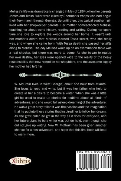 Melissa’s life was dramatically changed in May of 1864, when her parents James and Tessa Fuller were killed by Sherman’s troops who had begun their fiery march through Georgia. Up until then, this typical southern girl lived with her shopkeeper parents. Her mother homeschooled Melissa, teaching her about world history, reading and writing. During her spare time she love to explore the woods around her home. It wasn't until her mother’s death that Melissa learned Tessa secret, who she really was, and where she came from. With Tessa death she passed her gifts along to Melissa. The day Melissa woke up on an examination table was a real shocker, but there was more to come! As she began to realize her own destiny, her eyes were opened wide to the reality of the heavy responsibility that now rested on her shoulders, and the awesome legacy her mother had left her