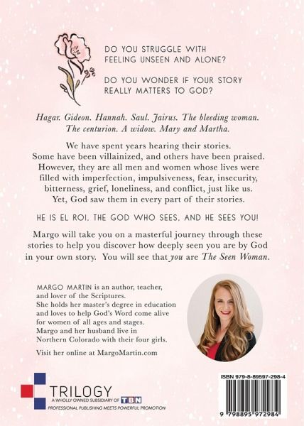 Do you struggle with feeling unseen and alone? Do you wonder if your story really matters to God? Hagar. Gideon. Hannah. Saul. Jairus. The bleeding woman. The centurion. A widow. Mary and Martha. We have spent years hearing their stories. Some have been villainized, and others have been praised. However, they are all men and women whose lives were filled with imperfection, impulsiveness, fear, insecurity, bitterness, grief, loneliness, and conflict, just like us. God saw them in every part of their stories. He is El Roi, the God who sees, and He sees YOU! Margo will take you on a masterful journey through these stories in the Scriptures to help you discover how deeply seen you are by God in your own story. You will discover that you are The Seen Woman.