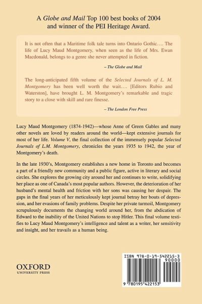 Elizabeth Waterston is a 2011 Fellow of The Royal Society of Canada. The final volume of the immensely successful The Selected Journals of L.M. Montgomery covers the years 1935 to 1942, the year of Montgomery's death. No longer dwelling in a farm community or a small rural village, Lucy Maud Montgomery explored life in downtown Toronto. Here she experienced the cultural riches the city had to offer while finding friendship and neighbourliness in the suburb of Swansea. The journal chronicles her hopes and satisfaction with her new home and neighbourhood, but also her struggles with her own and her husband's recurring bouts of depression, her worries about her sons' academic performance, and her thoughts on the world events during these years. The final volume in the series offers an intimate eyewitness account of life in a growing city, a friendly neighbourhood, a changing world, and of a troubling family dynamic from 1935 to 1942, all recorded with Lucy Maud Montgomery's sharp eye and characteristic wit.