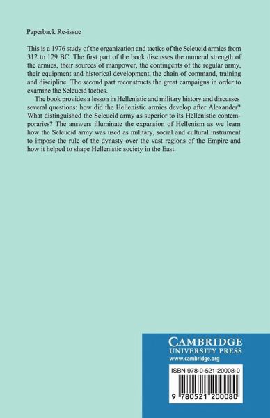 This is a 1976 study of the organization and tactics of the Seleucid armies from 312 to 129 BC. The first part of the book discusses the numerical strength of the armies, their sources of manpower, the contingents of the regular army, their equipment and historical development, the chain of command, training and discipline. The second part reconstructs the great campaigns in order to examine the Seleucid tactics. The book provides a lesson in Hellenistic and military history and discusses several questions: how did the Hellenistic armies develop after Alexander? What distinguished the Seleucid army as superior to its Hellenistic contemporaries? The answers illuminate the expansion of Hellenism as we learn how the Seleucid army was used as a military, social and cultural instrument to impose the rule of the dynasty over the vast regions of the Empire and how it helped to shape Hellenistic society in the East.