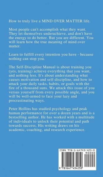 Use willpower to achieve the life that you want. Most people can't accomplish what they want. They let themselves underachieve, and don't have the energy to do better. But you are different. You will learn how the true meaning of mind over matter. Learn to fulfill every intention you have - because nothing can stop you. The Self-Discipline Manual is about training you (yes, training) achieve everything that you want, and nothing less. It's about understanding what causes motivation and self-discipline, and how to attack your daily tasks, habits, or goals with the fire of a thousand suns. We attack this issue of you versus yourself from every possible angle, and you will be well-armed to face your lazy and procrastinating ways. Extremely thorough, researched, and most importantly, actionable. Peter Hollins has studied psychology and peak human performance for over a dozen years and is a bestselling author. He has worked with a multitude of individuals to unlock their potential and path towards success. His writing draws on his academic, coaching, and research experience. How to make self-discipline automatic, second nature, and habitual.The biology of self-control and how to hack your body's limitations Understanding all the roadblocks to motivation and self-control - almost all are psychological Why you must start managing your TIME, not your energy The role your neurotransmitters play in self-discipline Clarifying your areas of control and interest for maximum adherence How to make discomfort your best friend How to "surf the urge" and "zazen" Emotional kung fu and how to use your emotions to your advantage Tools to get started, keep going, overcome distractions, and follow through every single time. Self-discipline is the ability to do what you don't want to do. It allows you to push through, conquer, and achieve. Without this gritty trait, nothing is possible in life. Keep that in mind.