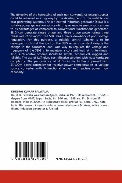 The objective of the harnessing of such non-conventional energy sources could be achieved in a big way by the development of the suitable low cost generating systems. The self excited induction generator (SEIG) is a suitable power generation source utilizing renewable energy sources due to its advantages as compared to conventional synchronous generator. SEIG can generate single phase and three phase power using three phase induction motor. The SEIG has a major drawback of poor voltage regulation. For this purpose, a suitable control scheme is to be developed such that the load on the SEIG remains constant despite the change in the consumer load. One way to regulate the voltage and frequency of the SEIG is to maintain a constant load at its terminals. Also, such control scheme should be simple, economical, rugged and reliable. The use of DSP gives cost effective solution with least hardware complexity. The performance of SEIG can be further improved with STACOM based controller for reactive power compensation or voltage source converter with bidirectional active and reactive power flow capability.