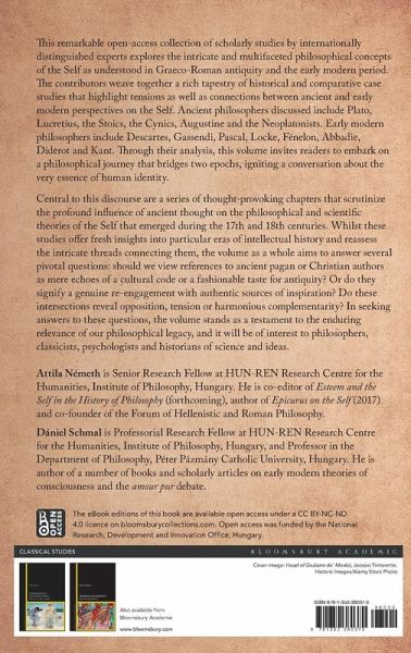 This remarkable open access collection of scholarly studies by internationally distinguished experts explores the intricate and multifaceted philosophical concepts of the Self as understood in Graeco-Roman antiquity and the early modern period. The contributors weave together a rich tapestry of historical and comparative case studies that highlight tensions as well as connections between ancient and early modern perspectives on the Self. Ancient philosophers discussed include Plato, Lucretius, the Stoics, the Cynics, Augustine and the Neoplatonists. Early modern philosophers include Descartes, Gassendi, Pascal, Locke, Fénelon, Abbadie, Diderot and Kant. Through their analysis, this volume invites readers to embark on a philosophical journey that bridges two epochs, igniting a conversation about the very essence of human identity. Central to this discourse are a series of thought-provoking chapters that scrutinise the profound influence of ancient thought on the philosophical and scientific theories of the Self that emerged during the 17th and 18th centuries. Whilst these studies offer fresh insights into particular eras of intellectual history and reassess the intricate threads connecting them, the volume as a whole aims to answer several pivotal questions: should we view references to ancient pagan or Christian authors as mere echoes of a cultural code or a fashionable taste for antiquity? Or do they signify a genuine re-engagement with authentic sources of inspiration? Do these intersections reveal opposition, tension or harmonious complementarity? In seeking answers to these questions, the volume stands as a testament to the enduring relevance of our philosophical legacy, and it will be of interest to philosophers, classicists, psychologists and historians of science and ideas. The eBook editions of this book are available open access under a CC BY-NC-ND 4.0 licence onbloomsburycollections.com. Open access was funded by the National Research, Development and Innovation Office, Hungary.
