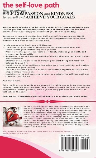 Are you ready to unlock the incredible power of self-love to transform your life? Do you want to cultivate a deep sense of self-compassion and self-kindness while pursuing your dreams? If yes, then keep reading. According to research studies from Neff and Self-Compassion.org (2016), individuals who possess higher levels of self-compassion tend to be more motivated and more successful over time. In this empowering book, you will discover:The essential principles of self-love and self-compassion that will revolutionize your relationship with yourself Practical techniques to overcome self-doubt, embrace your worth, and silence your inner critic Strategies to set and achieve meaningful goals that align with your values and aspirations Effective self-care practices to nurture your well-being and maintain balance in your life Insights on building resilience, bouncing back from setbacks, and staying motivated on your journey Tools to cultivate a positive mindset and replace negative self-talk with empowering affirmations Inspiring stories and exercises to help you navigate the self-love path and create lasting change And much more. Take the first step towards an empowered life while you embrace your unique journey, celebrate your successes, and cultivate a deep sense of kindness and compassion towards yourself, even if you've struggled with self-doubt and setbacks in the past.Embrace self-compassion and self-kindness, and achieve your goals today!