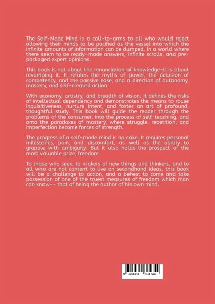 The Self-Made Mind is a call-to-arms to all who would reject allowing their minds to be pacified as the vessel into which the infinite amounts of information can be dumped. In a world where there seem to be ready-made answers, infinite scrolls, and pre-packaged expert opinions.This book is not about the renunciation of knowledge-it is about revamping it. It refutes the myths of power, the delusion of competency, and the passive ease, and a direction of autonomy, mastery, and self-created action.With economy, artistry, and breadth of vision, it defines the risks of intellectual dependency and demonstrates the means to rouse inquisitiveness, nurture intent, and foster an art of profound, thoughtful study. This book will guide the reader through the problems of the consumer, into the process of self-teaching, and onto the paradoxes of mastery, where struggle, repetition, and imperfection become forces of strength.The progress of a self-made mind is no cake. It requires personal milestones, pain, and discomfort, as well as the ability to grapple with ambiguity. But it also holds the prospect of the most valuable prize, freedomTo those who seek, to makers of new things and thinkers, and to all who are not content to live on secondhand ideas, this book will be a challenge to action, and a behest to come and take possession of one of the truest measures of freedom which man can know-- that of being the author of his own mind.