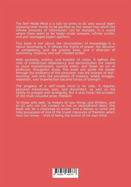 The Self-Made Mind is a call-to-arms to all who would reject allowing their minds to be pacified as the vessel into which the infinite amounts of information can be dumped. In a world where there seem to be ready-made answers, infinite scrolls, and pre-packaged expert opinions.This book is not about the renunciation of knowledge-it is about revamping it. It refutes the myths of power, the delusion of competency, and the passive ease, and a direction of autonomy, mastery, and self-created action.With economy, artistry, and breadth of vision, it defines the risks of intellectual dependency and demonstrates the means to rouse inquisitiveness, nurture intent, and foster an art of profound, thoughtful study. This book will guide the reader through the problems of the consumer, into the process of self-teaching, and onto the paradoxes of mastery, where struggle, repetition, and imperfection become forces of strength.The progress of a self-made mind is no cake. It requires personal milestones, pain, and discomfort, as well as the ability to grapple with ambiguity. But it also holds the prospect of the most valuable prize, freedomTo those who seek, to makers of new things and thinkers, and to all who are not content to live on secondhand ideas, this book will be a challenge to action, and a behest to come and take possession of one of the truest measures of freedom which man can know-- that of being the author of his own mind.