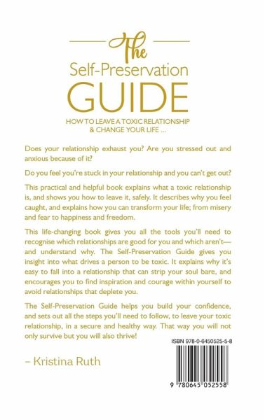The Self-Preservation Guide. How to leave a toxic relationship and change your life. Are you stressed out, exhausted and anxious about your relationship? Are you stuck in your relationship and can't get out? This practical, helpful book explains what is a toxic relationship and how to leave your toxic relationship safely! It also helps you understand why you are stuck, and how to transform your life from misery to happiness. This life changing book gives you all the tools you need to take a good look at your situation and the necessary steps to leave your toxic relationship in a safe and healthy way so you can not only survive but thrive!