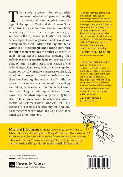 This study explores the relationship between the individual person (the self), the divine, and other people in the writings of the apostle Paul and the Roman Stoic Epictetus. It does so by examining self-involving actions expressed with reflexive pronouns (myself, yourself, etc.) in various kinds of sentences: for example, ""Examine yourself"" and ""You do not belong to yourself."" After situating the topic within the fields of linguistics and ancient Greek, the study then examines the reflexive constructions in Epictetus's Discourses, showing that reflexive texts express fundamental aspects of his ethic of rational self-interest in imitation of the indwelling rational deity. Next, the investigation examines the 109 reflexive constructions in Paul, providing an exegesis of each reflexive text and then synthesizing the results. Paul's reflexive phrases are essential statements of his theology and ethics, expressing an interconnected narrative Christology, narrative apostolic identity, and narrative ethic. Most importantly, the study finds that for Epictetus, concern for others is a rational means to self-realization, whereas for Paul, concern for others is a community ethic grounded in the story of the indwelling Christ and is the antithesis of self-interest.