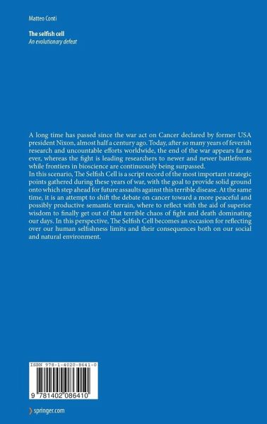 In this scenario, "The Selfish Cell" is a script record of the most important strategic points gathered during these years of war, with the goal to provide solid ground onto which to step ahead for future assaults against this terrible disease. At the same time, it is an attempt to shift the debate on cancer toward a more peaceful and possibly productive semantic terrain, where to reflect with the aid of superior wisdom to finally get out of that terrible chaos of fight and death dominating our days. In this perspective, "The selfish cell" becomes an occasion for reflecting the limits of our human selfishness and their consequences on both our social and natural environment.