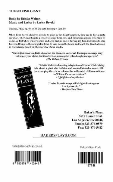 Musical / Characters: 5 female, 4 male (or 3f, 2m with doubling) Scenery: Unit Set When four bored children decide to play in the Giant's garden, they are in for a nasty surprise. The Giant builds a fence to keep them out, and threatens anyone who tries to come in. But when winter comes and sees that no one is having any fun, it decides to stay forever. It's up to the new girl in town to take down the fence and teach the Giant a lesson in friendship. Based on the story by Oscar Wilde. The Selfish Giant was originally produced by the celebrated and critically-acclaimed Manhattan Children's Theatre. "The Selfish Giant is a kids' show, but the theme is universal. Its simple message may influence your child, but its effect on you may be refreshingly unexpected." -The Tribeca Tribune.