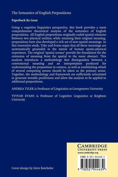 Using a cognitive linguistics perspective, this book provides a comprehensive, theoretical analysis of the semantics of English prepositions. All English prepositions originally coded spatial relations between two physical entities; while retaining their original meaning, prepositions have also developed a rich set of non-spatial meanings. In this study, Tyler and Evans argue that all these meanings are systematically grounded in the nature of human spatio-physical experience. The original 'spatial scenes' provide the foundation for the extension of meaning from the spatial to the more abstract. This analysis articulates an alternative methodology that distinguishes between a conventional meaning and an interpretation produced for understanding the preposition in context, as well as establishing which of several competing senses should be taken as the primary sense. Together, the methodology and framework are sufficiently articulated to generate testable predictions and allow the analysis to be applied to additional prepositions.