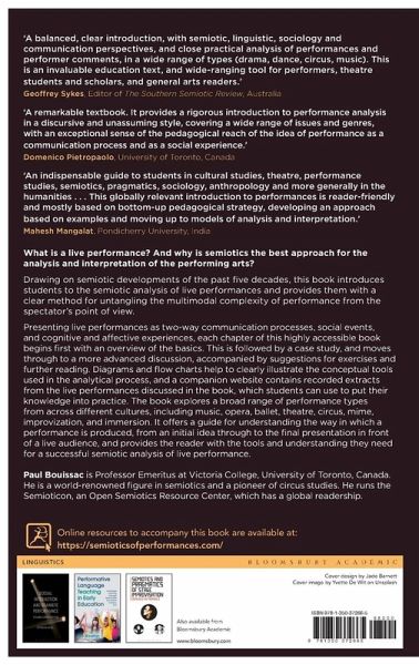 What is a live performance? And why is semiotics the best approach for the analysis and interpretation of the performing arts? Drawing on semiotic developments of the past five decades, this book introduces students to the semiotic analysis of live performances and provides them with a clear method for untangling the multimodal complexity of performance from the spectator's point of view. Presenting live performances as two-way communication processes, social events, and cognitive and affective experiences, each chapter of this highly accessible book begins first with an overview of the basics. This is followed by a case study, and moves through to a more advanced discussion, accompanied by suggestions for exercises and further reading. Diagrams and flow charts help to clearly illustrate the conceptual tools used in the analytical process, and a companion website contains recorded extracts from the live performances discussed in the book, which students can use to put their knowledge into practice. The book explores a broad range of performance types from across different cultures, including music, opera, ballet, theatre, circus, mime, improvisation, and immersion. It offers a guide for understanding the way in which a performance is produced, from an initial idea through to the final presentation in front of a live audience, and provides the reader with the tools and understanding they need for a successful semiotic analysis of live performance.