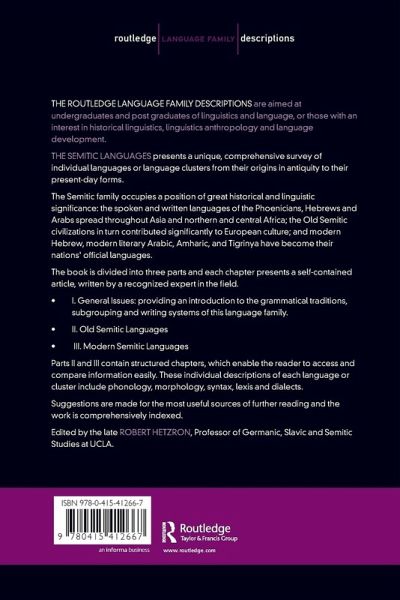 The Semitic languages are a family of languages spoken by more that 370 million people across much of the Middle East and North and East Africa. This is the first general survey of those languages, including the Arab and Aramaic dialects and various languages of Ethiopia. Containing twenty-two chapters that present a comprehensive survey of this language family from its origins in antiquity to the present day, The Semitic Languages is an essential source of reference for the specialist and the lay reader.