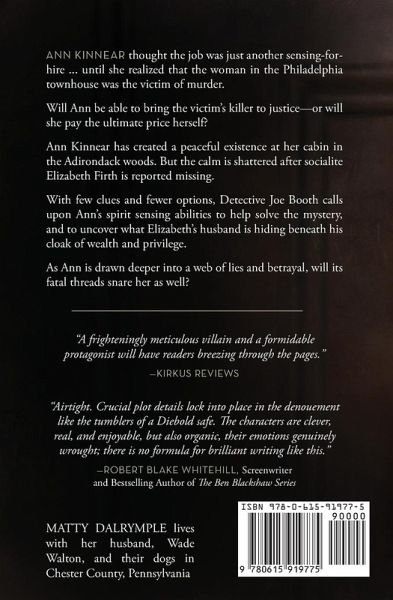 Ann Kinnear thought the job was just another sensing-for-hire ... ... until she realized that the woman in the Philadelphia townhouse was the victim of murder. Will Ann be able to bring the victim's killer to justice-or will she pay the ultimate price herself? Ann Kinnear has created a peaceful existence at her cabin in the Adirondack woods. But the calm is shattered after socialite Elizabeth Firth is reported missing. With few clues and fewer options, Detective Joe Booth calls upon Ann's spirit sensing abilities to help solve the mystery, and to uncover what Elizabeth's husband is hiding beneath his cloak of wealth and privilege. As Ann is drawn deeper into a web of lies and betrayal, will its fatal threads snare her as well? Find out now in Book 1 of the Ann Kinnear Suspense Novels! "The sense of death is most in apprehension; And the poor beetle that we tread upon, In corporal sufferance feels a pang as great As when a giant dies." - William Shakespeare, "Measure for Measure"