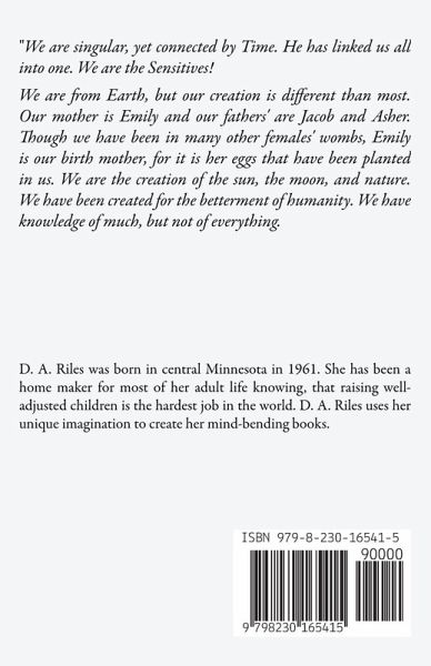"We are singular, yet connected by Time. He has linked us all into one. We are the Sensitives! We are from Earth, but our creation is different than most. Our mother is Emily and our fathers' are Jacob and Asher. Though we have been in many other females' wombs, Emily is our birth mother, for it is her eggs that have been planted in us. We are the creation of the sun, the moon, and nature. We have been created for the betterment of humanity. We have knowledge of much, but not of everything.