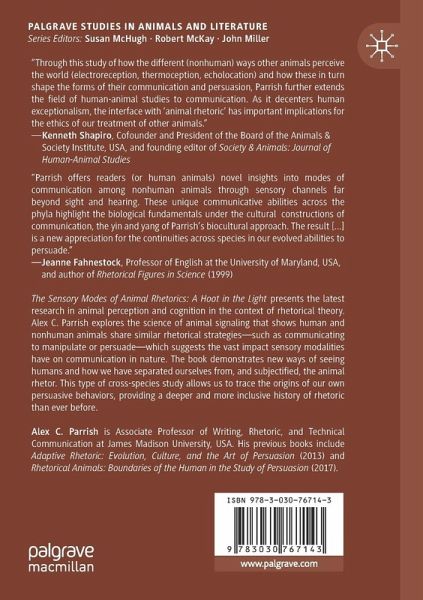 The Sensory Modes of Animal Rhetorics: A Hoot in the Light presents the latest research in animal perception and cognition in the context of rhetorical theory. Alex C. Parrish explores the science of animal signaling that shows human and nonhuman animals share similar rhetorical strategies-such as communicating to manipulate or persuade-which suggests the vast impact sensory modalities have on communication in nature. The book demonstrates new ways of seeing humans and how we have separated ourselves from, and subjectified, the animal rhetor. This type of cross-species study allows us to trace the origins of our own persuasive behaviors, providing a deeper and more inclusive history of rhetoric than ever before.