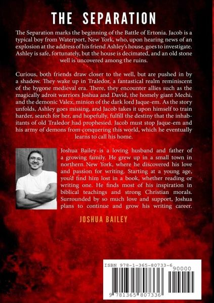 The Separation marks the beginning of the Battle of Ertonia. Jacob is a typical boy from Waterport, New York, who, upon hearing news of an explosion at the address of his friend Ashley's house, goes to investigate. Ashley is safe, fortunately, but the house is decimated, and an old stone well is uncovered among the ruins. Curious, both friends draw closer to the well, but are pushed in by a shadow. They wake up in Traledor, a fantastical realm reminiscent of the bygone medieval era. There, they encounter allies such as the magically adroit warriors Joshua and David, the homely giant Mechi, and the demonic Valex, minion of the dark lord Jaque-em. As the story unfolds, Ashley goes missing, and Jacob takes it upon himself to train harder, search for her, and hopefully, fulfill the destiny that the inhabitants of old Traledor had prophesied. Jacob must stop Jaque-em and his army of demons from conquering this world, which he eventually learns to call his home.