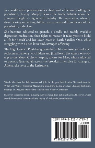 In a world where procreation is a chore and addiction is killing the population, Franny Murphy is forced from the only home she's ever known upon her youngest daughter's eighteenth birthday. The Separation, whereby those bearing and raising children are sequestered from the rest of the population, is the Law. She becomes addicted to quench, a deadly and readily available depression medication, and then fights to recover. It takes years to build a life for herself and her lover, Matt. Rooted on Earth Satellite One, she struggles with a jilted lover and her estranged older offspring, who'd chosen child-free lives. The High Council President grooms her as his successor, yet seeks another successor among her children and her jilted lover. She takes a one-way trip to the Moon Colony hospice, to care for Matt, who'd only pretended addiction recovery. Granted all-access as a resident, she broadcasts her plea for change as Athena, the voice of the Resistance.
