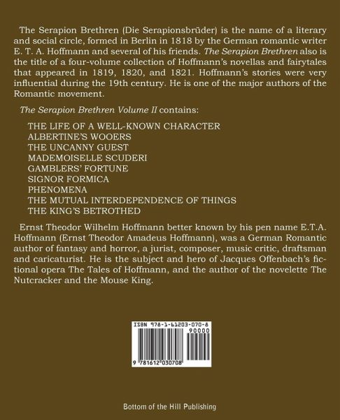 The Serapion Brethren (Die Serapionsbrüder) is the name of a literary and social circle, formed in Berlin in 1818 by the German romantic writer E. T. A. Hoffmann and several of his friends. The Serapion Brethren also is the title of a four-volume collection of Hoffmann's novellas and fairytales that appeared in 1819, 1820, and 1821.Hoffmann's stories were very influential during the 19th century. He is one of the major authors of the Romantic movement. Contents of Vol II include: THE LIFE OF A WELL-KNOWN CHARACTER ALBERTINE'S WOOERS THE UNCANNY GUEST MADEMOISELLE SCUDERI GAMBLERS' FORTUNE SIGNOR FORMICA PHENOMENA THE MUTUAL INTERDEPENDENCE OF THINGS THE KING'S BETROTHED Ernst Theodor Wilhelm Hoffmann better known by his pen name E.T.A. Hoffmann (Ernst Theodor Amadeus Hoffmann), was a German Romantic author of fantasy and horror, a jurist, composer, music critic, draftsman and caricaturist. He is the subject and hero of Jacques Offenbach's fictional opera The Tales of Hoffmann, and the author of the novelette The Nutcracker and the Mouse King.