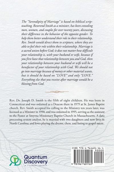 The "Serendipity of Marriage" is based on biblical scrip-teaching. Reverend Smith as a minister, has been consoling men, women, and couples for over twenty years, discussing their difference in the behavior of the opposite gender. To help them better understand their role in their relationship, Rev. Smith would direct them to scripture, where they are able to feel their role within their relationship. Marriage is a sacred union before God; it does not matter how difficult your relationship is, with your husband or wife, because if you first have that relationship between you and God, then your relationship between your husband or wife will be a benefactor of your relationship with God. We should not go into marriage because of money or other material wants, but it should be based on "LOVE" and only "LOVE." Everything else that you receive after marriage would be a blessing from God. ¿¿Rev. Dr. Joseph D. Smith is the fifth of eight children. He was born in Connecticut and was ordained as a Deacon there in 1979 at St. James Baptist church. Rev. Smith accepted his calling to the Ministry ten years later, was licensed as a Minister in 1990, and was ordained in 1995, serving as the assistant to the Pastor at Smyrna Missionary Baptist Church in Massachusetts. A data processing system analyst, he is married with two daughters and now lives in North Carolina; and loves playing the drums, chess, and listing to gospel music.