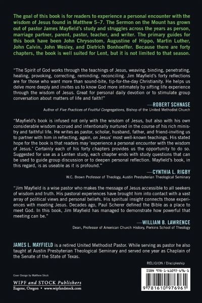 The goal of this book is for readers to experience a personal encounter with the wisdom of Jesus found in Matthew 5-7. The Sermon on the Mount has grown out of pastor James Mayfield's study and struggles across the years as person, marriage partner, parent, pastor, teacher, and writer. The primary guides for this book have been John Chrysostom, Augustine of Hippo, Martin Luther, John Calvin, John Wesley, and Dietrich Bonhoeffer. Because there are forty chapters, the book is well suited for Lent, but it is not limited to that season.