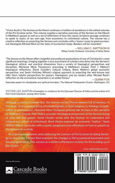 Although a central Christian text, the Sermon on the Mount remains full of mystery. In this book, an ecumenical group of scholars guides us from exegesis to theology to application to proclamation. Marianne Meye Thompson grounds the Sermon in the narrative of Matthew's Gospel. Piotr Mäysz provides theological amazement at the Sermon being at once law and gospel. David Cloutier works with the Sermon to understand and critique our culture of victimhood. Brent Waters explores its economic ""realism."" Sarah Hinlicky Wilson concludes with a poetic paraphrase and reflections on how to preach on the Sermon as a whole. As a special supplement, and continuing the concern of Pro Ecclesia for doing theology ecumenically, Michael Root examines the changes in the ecumenical movement over the past generation. This volume as a whole is offered pro ecclesia, for the building up of the church.