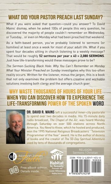 Very little communication takes place between most pastors/priests and their congregants regarding the weekly sermon/homily. This lack of constructive dialogue has resulted in Sunday messages that are not only out-of-touch with where parishioners are living, but for the most part what's said isn't remembered much beyond the church parking lot. Dr. Mains contends that people in the pew can best judge when a sermon is helpful to them and when it isn't. So why not include them in the process of both preparing and evaluating sermons? Not preaching the sermons. . . . .but again, preparing and evaluating them. He makes these changes sound so simple and practical that you can't help but wonder, "Why weren't these ideas implemented years ago?" Most people in the pew don't realize how integral they are to finding a solution to this problem. But the pulpit/pew combination can be an incredibly powerful team, so let's begin to work together to help solve this mystery of what's happening to sermons. This is not a negative book or one that only points out problems. Instead, it's a positive, practical and encouraging read that should fill you with hope for not only your local congregation, but churches everywhere.