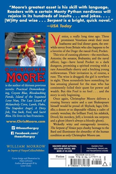 Venice, a really long time ago. Three prominent Venetians await their most loathsome and foul dinner guest, the erstwhile envoy from Britain who also happens to be a favorite of the Doge: the rascal-Fool, Pocket. This trio of cunning plotters?the merchant, Antonio; the senator, Brabantio; and the naval officer, Iago?have lured Pocket to a dark dungeon, promising a spirited evening with a rare Amontillado sherry and a fetching young noblewoman. Their invitation is, of course, a ruse. The wine is drugged; the girl is nowhere in sight. These scoundrels have something far less amusing planned for the man who has consistently foiled their quest for power and wealth. But this Fool is no fool . . . and the story is only beginning. Once again, Christopher Moore delivers a rousing literary satire and a cast Shakespeare himself would be proud of: Shylock; Iago; Othello; a dozen or so disposable villains; a cadre of comely wenches; the brilliant Fool; his sidekick, Drool; his monkey, Jeff; a lovesick sea serpent; and a ghost (there's always a bloody ghost). Wickedly witty and outrageously inventive, The Serpent of Venice pays cheeky homage to the Bard and illuminates the absurdity of the human condition as only Christopher Moore can.
