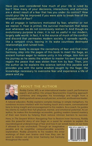 Roddy Carter, MD, is an international master coach, performance expert, and author. His unique Neurocentric Coaching approach combines and integrates his knowledge and insight from a distinguished career as a physician, scientist, and business leader.A natural educator, Roddy explains complex biology in simple metaphors. He combines incisive intellect with his healing touch and a warm, conversational tone to bring insight and encouragement to his readers. As a coach, he guides his clients to realize their full physical, mental, and emotional potential.In his first book, BodyWHealth: Journey to Abundance, he makes this knowledge accessible to all seeking health, happiness, and prosperity. In Fireside Wisdom: Conversations to Inspire Personal Mastery, Roddy guides readers toward mastery of their own brains, removing intrinsic barriers to success. In The Problem with Anger: And How to Solve It, Roddy creatively explores the neural pathways and algorithms we develop as children, the ways in which they hamper us as adults-specifically in the expression of anger-and how we can retrain our brain to enjoy lives filled with peace and joy. In Becoming Unstoppable: Your Neurocentric Coaching Guide to Achieving Unstoppable Success, Roddy brings his one-of-a-kind coaching directly to readers.And here, in The Serpent Within: Navigating Fear to Restore Inner Harmony, Roddy uses the powerful story of one Sage on a quest for wisdom to explain the neurobiological underpinnings of fear and how it can wreak havoc on our lives if allowed to rule unchecked. Through an imaginative parable and its insightful, comprehensible scientific explanation, Roddy presents to his readers the inner workings of their own brains-and how they can be used to restore not only inner harmony but harmony throughout the world.