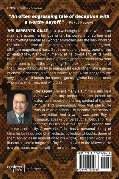 THE SERPENT'S GUILE is a psychological thriller with three main characters - a famous writer, his personal chauffeur and the unwitting biracial sex worker embroiled into the dark world of the writer. All three of them hiding secrets, all puppets of greed, all three magnificent liars. Set in an opulent background of the privileged few, it shows humanity at its lowest and at its most human element. Unlike books of same genre, readers know who the serpent is from the beginning. The crux is how each one of the three protagonists try to manipulate each other - like a game of chess, a charade, a cat and mouse game. A cliff hanger to the very last page, it keeps the readers guessing what happens next: who wins, who lives, and who dies.