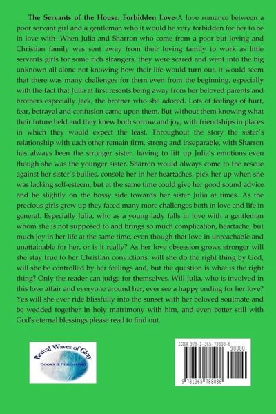 The Servants of the House: Forbidden Love-A love romance between a poor servant girl and a gentleman who it would be very forbidden for her to be in love with--When Julia and Sharron who come from a poor but loving and Christian family was sent away from their loving family to work as little servants girls for some rich strangers, they were scared and went into the big unknown all alone not knowing how their life would turn out, it would seem that there was many challenges for them even from the beginning, especially with the fact that Julia at first resents being away from her beloved parents and brothers especially Jack, the brother who she adored. Lots of feelings of hurt, fear, betrayal and confusion came upon them. But without them knowing what their future held and they knew both sorrow and joy, with friendships in places in which they would expect the least. Throughout the story the sister's relationship with each other remain firm, strong and inseparable, with Sharron has always been the stronger sister, having to lift up Julia's emotions even though she was the younger sister. Sharron would always come to the rescue against her sister's bullies, console her in her heartaches, pick her up when she was lacking self-esteem, but at the same time could give her good sound advice and be slightly on the bossy side towards her sister Julia at times. As the precious girls grew up they faced many more challenges both in love and life in general. Especially Julia, who as a young lady falls in love with a gentleman whom she is not supposed to and brings so much complication, heartache, but much joy in her life at the same time, even though that love in unreachable and unattainable for her, or is it really? As her love obsession grows stronger will she stay true to her Christian convictions, will she do the right thing by God, will she be controlled by her feelings and, but the question is what is the right thing? Only the reader can judge for themselves. Will Julia, who is involved in this love affair and everyone around her, ever see a happy ending for her love? Yes will she ever ride blissfully into the sunset with her beloved soulmate and be wedded together in holy matrimony with him, and even better still with God's eternal blessings please read to find out.