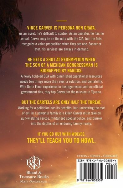 Vince Carver is persona non grata. As an asset, he's difficult to control. As an operator, he has no equal. Carver may be on the outs with the CIA, but the feds recognize a value proposition when they see one. Sooner or later, his services are always in demand. The son of a Mexican congressman is kidnapped by narcos. A newly hobbled DEA with diminished operational resources needs a solution. With Delta Force experience in hostage rescue and no official government ties, they tap Carver for the mission in Tijuana. But the cartels are only half the threat. If you go out with wolves, they'll teach you to howl. Working for a politician has benefits, but in a city notorious for corruption, the wrong connections can get you killed. Gun-wielding narcos and militarized special police come out in force, but the biggest danger lurks in the depths of an enduring family rivalry. The Service of Wolves by Matt Sloane is a powerhouse mystery of love and betrayal. From a seedy Tijuana nightclub to the private armies and hidden quarters of Mexico's elite, experience a descent straight to the underbelly of the human condition. Recommended for fans of Lee Child's Jack Reacher, Vince Flynn's Mitch Rapp, Robert Ludlum's Jason Bourne, Tom Clancy's Jack Ryan, and Brad Thor's Scot Harvath. ¿¿¿¿¿ "Sensational. A taut thriller that has a great deal more to offer than bullets and brawn." ¿¿¿¿¿ "The fight scenes are the best you'll find in crime fiction." ¿¿¿¿¿ "Very real and very very good."