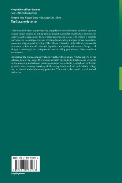 This book is the first comprehensive compilation of deliberations on whole genome sequencing of sesame including genome assembly, annotation, structure and synteny analysis, and sequencing of its chloroplast genome and also its wild species. It presents narratives on classical genetics and breeding, tissue culture and genetic transformation, molecular mapping and breeding. Other chapters describe the beneficial components in sesame protein and oil, botanical depictions and cytological features. Prospects of designed breeding in the post-genomics era including gene discovery have also been enumerated.