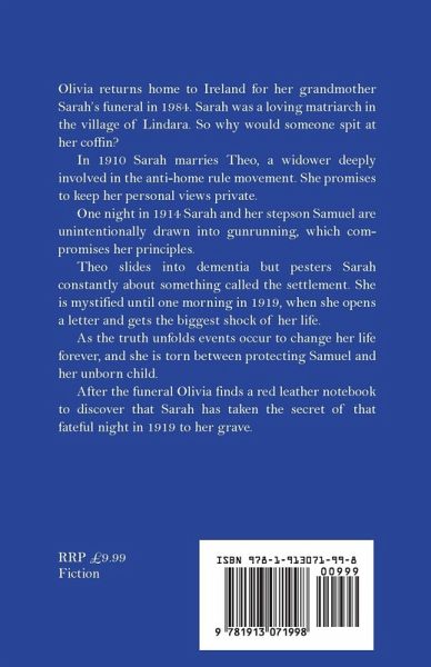 Olivia returns home for her grandmother Sarah's funeral in 1984. Sarah was a loving matriarch in the village of Lindara. So why would someone spit at her coffin? In 1910 Sarah marries Theo, a widower deeply involved in the anti-home rule movement. She promises to keep her personal views private. One night in 1914 Sarah and her stepson Samuel are unintentionally drawn into gunrunning, which compromises her principles. Theo slides into dementia but pesters Sarah constantly about something called the settlement. She is mystified until one morning in 1919, when she opens a letter and gets the biggest shock of her life. As the truth unfolds events occur to change her life forever, and she is torn between protecting Samuel and her unborn child. After the funeral Olivia finds a red leather notebook to discover that Sarah has taken the secret of that fateful night in 1919 to her grave.
