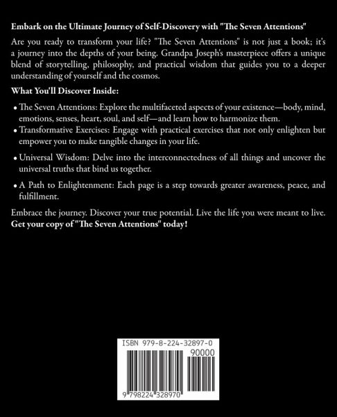 Embark on the Ultimate Journey of Self-Discovery with "The Seven Attentions" Are you ready to transform your life? "The Seven Attentions" is not just a book; it's a journey into the depths of your being. Grandpa Joseph's masterpiece offers a unique blend of storytelling, philosophy, and practical wisdom that guides you to a deeper understanding of yourself and the cosmos. What You'll Discover Inside: The Seven Attentions: Explore the multifaceted aspects of your existence-body, mind, emotions, senses, heart, soul, and self-and learn how to harmonize them. Transformative Exercises: Engage with practical exercises that not only enlighten but empower you to make tangible changes in your life. Universal Wisdom: Delve into the interconnectedness of all things and uncover the universal truths that bind us together. A Path to Enlightenment: Each page is a step towards greater awareness, peace, and fulfillment. Embrace the journey. Discover your true potential. Live the life you were meant to live. Get your copy of "The Seven Attentions" today!