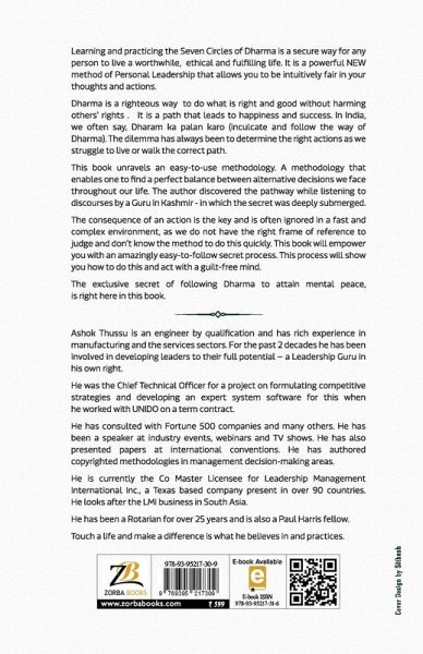Learning and practicing The Seven Circles of Dharma is a secure way for any person to live a worthwhile, ethical and fulfilling life. It is a powerful NEW method of Personal Leadership that allows you to be intuitively fair in your thoughts and actions. Dharma can be said to be the righteous way of action to do what is right and good without harming others' rights, it is a path that leads to happiness and success. In India we often day, Dharam ka palan karo (inculcate and follow the way of Dharma), the dilemma has always been to figure out these right actions as we strain to live or walk the correct path. This book unravels the easy-to-use methodology that enables one to do this and helps find a worth it perfect balance between alternative decisions which we face throughout our life. The author discovered the pathway while listening to some rambling discourses by a Guru in Kashmir - in which the secret was deeply submerged and hidden. The consequence of action is key and is often ignored in fast and complex environments as we do not have the right frame of reference to judge and don't know the method to do this quicky. This book will empower you with an amazingly easy to follow secret process that shows you how to do this and act with a guilt free mind. It is Dharma - the correct way of thinking and resulting action that YOU will master for greater mental peace. The exclusive secret of how-to is inside The Seven Circles of Dharma