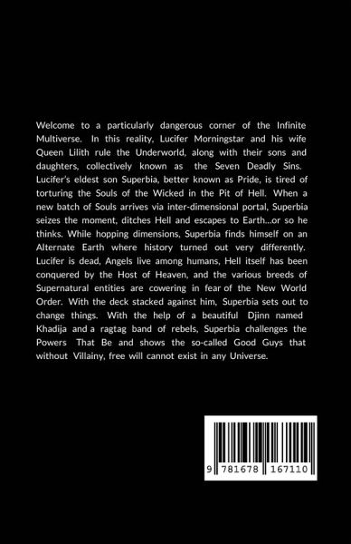 Welcome to a particularly dangerous corner of the Infinite Multiverse. In this reality, Lucifer Morningstar and his wife Queen Lilith rule the Underworld, along with their sons and daughters, collectively known as the Seven Deadly Sins. Lucifer's eldest son Superbia, better known as Pride, is tired of torturing the Souls of the Wicked in the Pit of Hell. When a new batch of Souls arrives via inter-dimensional portal, Superbia seizes the moment, ditches Hell and escapes to Earth...or so he thinks. While hopping dimensions, Superbia finds himself on an Alternate Earth where history turned out very differently. Lucifer is dead, Angels live among humans, Hell itself has been conquered by the Host of Heaven, and the various breeds of Supernatural entities are cowering in fear of the New World Order. With the deck stacked against him, Superbia sets out to change things. With the help of a beautiful Djinn named Khadija and a ragtag band of rebels, Superbia challenges the Powers That Be and shows the so-called Good Guys that without Villainy, free will cannot exist in any Universe.