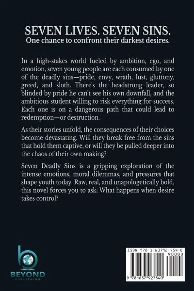 Seven lives. Seven sins. One chance to confront their darkest desires. In a high-stakes world fueled by ambition, ego, and emotion, seven young people are each consumed by one of the deadly sins-pride, envy, wrath, lust, gluttony, greed, and sloth. There's the headstrong leader, so blinded by pride he can't see his own downfall, and the ambitious student willing to risk everything for success. Each one is on a dangerous path that could lead to redemption-or destruction. As their stories unfold, the consequences of their choices become devastating. Will they break free from the sins that hold them captive, or will they be pulled deeper into the chaos of their own making? Seven Deadly Sins is a gripping exploration of the intense emotions, moral dilemmas, and pressures that shape youth today. Raw, real, and unapologetically bold, this novel forces you to ask: What happens when desire takes control?