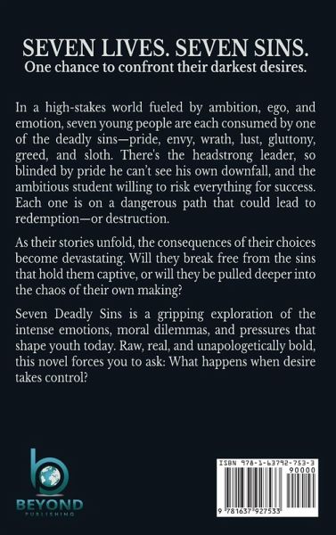 Seven lives. Seven sins. One chance to confront their darkest desires. In a high-stakes world fueled by ambition, ego, and emotion, seven young people are each consumed by one of the deadly sins-pride, envy, wrath, lust, gluttony, greed, and sloth. There's the headstrong leader, so blinded by pride he can't see his own downfall, and the ambitious student willing to risk everything for success. Each one is on a dangerous path that could lead to redemption-or destruction. As their stories unfold, the consequences of their choices become devastating. Will they break free from the sins that hold them captive, or will they be pulled deeper into the chaos of their own making? Seven Deadly Sins is a gripping exploration of the intense emotions, moral dilemmas, and pressures that shape youth today. Raw, real, and unapologetically bold, this novel forces you to ask: What happens when desire takes control?