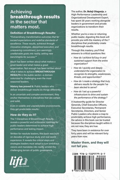 Discover the essential disciplines that produce breakthrough results for public sector leaders seeking to deliver exceptionally transformative outcomes in highly complex and challenging environments. In the world of leadership, there are many promising beginnings but few triumphant endings due to underestimated complexities, particularly in the public sector. Yet, valuable resources to support public leaders on the journey to high performance remain scarce. The Seven Disciplines of Breakthrough Results: How to Predictably Achieve High Performance for Director-Generals, Chief Executive Officers, Executive Secretaries, Permanent Secretaries, Directors, and Senior Leadership Teams in the Public Sector unveils a meticulously crafted roadmap to achieve unparalleled success in public sector leadership. Drawing on over twenty-eight years of hands-on experience and strategic consultation across Africa, Dr. Bolaji Olagunju, seasoned leadership expert, has distilled within this book the seven core disciplines behind transformational results, including strategies for navigating political pressures, bureaucratic inertia, and other challenges of public leadership. When effectively executed, these disciplines can radically transform outcomes for leaders in the most challenging environments: 1. Dialogue: Building trust through effective communication. 2. Discover: Identifying key opportunities for success. 3. Diagnose: Uncovering the root causes of organizational issues to facilitate data-driven decisions for maximum impact. 4. Design: Moving from vision to actionable strategies and structures. 5. Delegate: Empowering teams to implement strategies and achieve peak performance. 6. Drive: Converting ideas and strategies into measurable results. 7. Deliver: Setting up systems and infrastructures to institutionalize high performance within organizations. This is more than a book; it's a call to action and blueprint for leaders committed to making a lasting difference. Transform your leadership approach and deliver extraordinary outcomes.