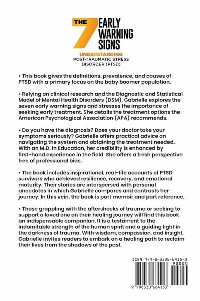 ¿ This book gives the definitions, prevalence, and causes of PTSD with a primary focus on the baby boomer population. ¿ Relying on clinical research and the Diagnostic and Statistical Model of Mental Health Disorders (DSM), Gabrielle explores the seven early warning signs and stresses the importance of seeking early treatment. She details the treatment options the American Psychological Association (APA) recommends. ¿ Do you have the diagnosis? Does your doctor take your symptoms seriously? Gabrielle offers practical advice on navigating the system and obtaining the treatment needed. With an M.D. in Education, her credibility is enhanced by first-hand experience in the field. She offers a fresh perspective free of professional bias. ¿ The book includes inspirational, real-life accounts of PTSD survivors who achieved resilience, recovery, and emotional maturity. Their stories are interspersed with personal anecdotes in which Gabrielle compares and contrasts her journey. In this vein, the book is part memoir and part reference. ¿ Those grappling with the aftershocks of trauma or seeking to support a loved one on their healing journey will find this book an indispensable companion. It is a testament to the indomitable strength of the human spirit and a guiding light in the darkness of trauma. With wisdom, compassion, and insight, Gabrielle invites readers to embark on a healing path to reclaim their lives from the shadows of the past.