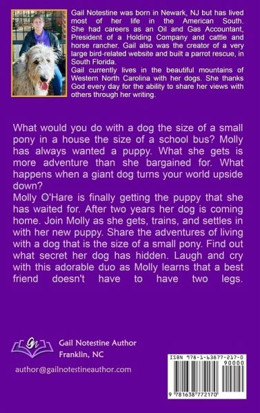 Gail Notestine was born in Newark, NJ but has lived most of her life in the American South. After moving to Texas in 1978, she had careers as an Oil and Gas Accountant, President of a Holding Company, and cattle and horse rancher.After leaving Texas in 1989, she and her late husband traveled the USA and Central America for ten years, where she became interested in the study of parrots in their natural habitat. During the time traveling she and her husband built a very successful Jewelry business in over thirty-six Renaissance Faires.Gail also built the largest bird-related website in the world and built a parrot rescue, in South Florida, where she had between thirty-five and forty birds. During this time, she traveled the country lecturing about proper companion bird care.After moving to North Carolina, she took time to relax with her late husband and dogs. She enjoys her wonderful dogs, hiking the beautiful trails, scuba diving and especially writing.Gail lives in the beautiful mountains of Western North Carolina with her remaining two dogs. She thanks God every day for the wonderful life she has had and the ability to share her views with others through her writing. Gail decided to write the Molly and Grainne series in memory of her heart hound, the original Grainne.She has also written books under the name Elizabeth Aaron, Echo Bird and Dustbunny Too.
