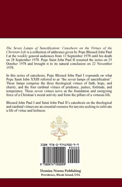 The Seven Lamps of Sanctification: Catechesis on the Virtues of the Christian Life is a collection of addresses given by Pope Blessed John Paul I at the weekly general audiences from 13 September 1978 until his death on 28 September 1978. Pope Saint John Paul II resumed the series on 25 October 1978 and brought it to its natural conclusion on 22 November 1978. In this series of catechesis, Pope Blessed John Paul I expounds on what Pope Saint John XXIII referred to as "the seven lamps of sanctification" These lamps comprise the three theological virtues of faith, hope, and charity, and the four cardinal virtues of prudence, justice, fortitude, and temperance. These seven virtues serve as the foundation and energizing force of a Christian's moral activity and form the pillars of a virtuous life. Blessed John Paul I and Saint John Paul II's catechesis on the theological and cardinal virtues are an essential resource for anyone seeking to cultivate a life of virtue and holiness. "The goal of a virtuous life is to become like God" (Saint Gregory of Nyssa, De beatitudinibus, oratio 1).