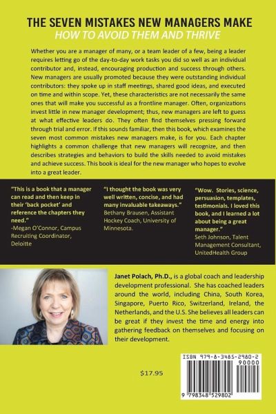 Whether you are a manager of many, or a team leader of a few, being a leader requires letting go of the day-to-day work tasks you did so well as an individual contributor and, instead, encouraging production and success through others. New managers are usually promoted because they were outstanding individual contributors: they spoke up in staff meetings, shared good ideas, and executed on time and within scope. Yet, these characteristics are not necessarily the same ones that will make you successful as a frontline manager. Often, organizations invest little in new manager development; thus, new managers are left to guess at what effective leaders do. They often find themselves pressing forward through trial and error. If this sounds familiar, then this book, which examines the seven most common mistakes new managers make, is for you. Each chapter highlights a common challenge that new managers will recognize and then describes strategies and behaviors to build the skills needed to avoid mistakes and achieve success. This book is ideal for the new manager who hopes to evolve into a great leader.