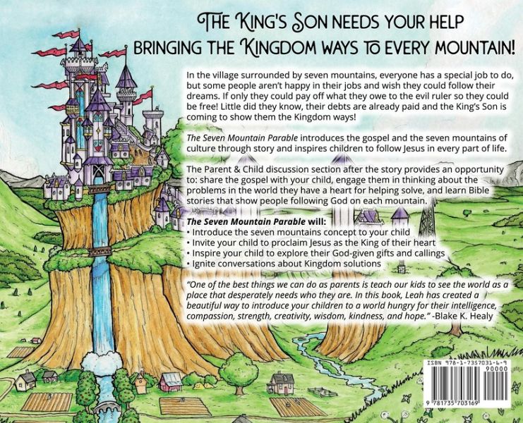 The King's Son needs your help bringing the Kingdom ways to every mountain! In the village surrounded by seven mountains, everyone has a special job to do, but some people aren't happy in their jobs and wish they could follow their dreams. If only they could pay off what they owe to the evil ruler so they could be free! Little did they know, their debts are already paid and the King's Son is coming to show them the Kingdom ways! The Seven Mountain Parable introduces the gospel and the seven mountains of culture through story and inspires children to follow Jesus in every part of life. The Parent & Child discussion section after the story provides an opportunity to: share the gospel with your child, engage them in thinking about the problems in the world they have a heart for helping solve, and learn Bible stories that show people following God on each mountain. The Seven Mountain Parable will: * Introduce the seven mountains concept to your child * Invite your child to proclaim Jesus as the King of their heart * Inspire your child to explore their God-given gifts and callings * Ignite conversations about Kingdom solutions "One of the best things we can do as parents is teach our kids to see the world as a place that desperately needs who they are. In this book, Leah has created a beautiful way to introduce your children to a world hungry for their intelligence, compassion, strength, creativity, wisdom, kindness, and hope." -Blake Healy