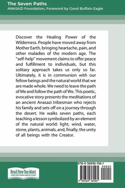 Discover the Healing Power of the Wilderness. People have moved away from Mother Earth, bringing heartache, pain, and other maladies of the modern age. The ''self-help'' movement claims to offer peace and fulfillment to individuals, but this solitary approach takes us only so far. Ultimately, it is in communion with our fellow beings and the natural world that we are made whole. We need to leave the path of Me and follow the path of We. This poetic, evocative story presents the meditations of an ancient Anasazi tribesman who rejects his family and sets off on a journey through the desert. He walks seven paths, each teaching a lesson symbolized by an element of the natural world: light, wind, water, stone, plants, animals, and, finally, the unity of all beings with the Creator. The Seven Paths reveals a source of wisdom, restoration, and renewal familiar to native people but lost to the rest of us, seven elements among nature that combine to mend human hearts.